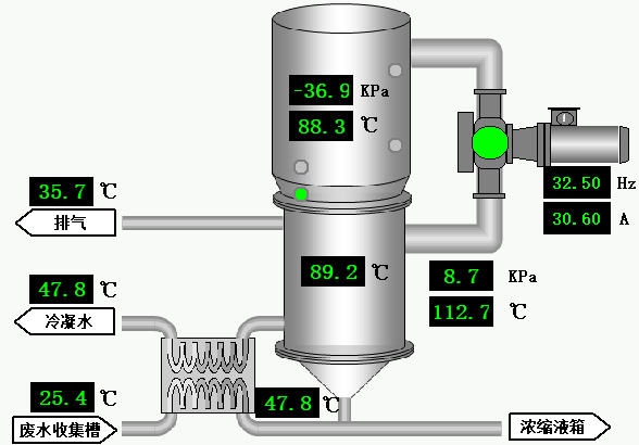 ③ 蒸發(fā)罐內(nèi)為-35至55KPA(可設(shè)定)負(fù)壓條件運(yùn)行,污水升溫至80-90攝氏度開始沸騰,產(chǎn)生大量水蒸汽。