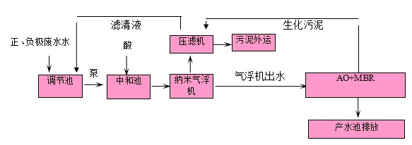 正負(fù)極廢水混合調(diào)節(jié)后,通過加藥中和后經(jīng)過絮凝、氣浮、壓濾處理后出水進(jìn)入到到中間池,中間池用泵輸送至一體化設(shè)備進(jìn)行生化處理。