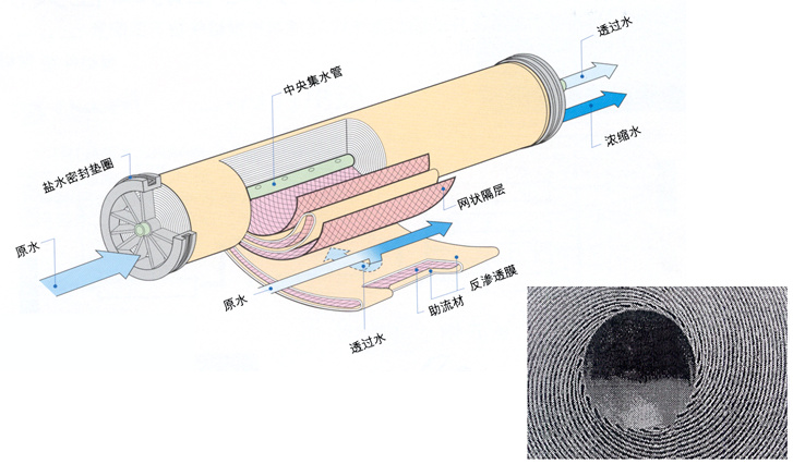 反滲透(Reveser Osmosis,簡稱RO)是以壓力為驅動力,并利用反滲透膜只能透過水而不能透過溶質的選擇性而使水溶液中溶質與水分離的技術,因為和自然滲透的方向相反,因此稱為反滲透。其工作壓力很高(1~25MPa)。
